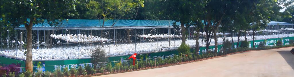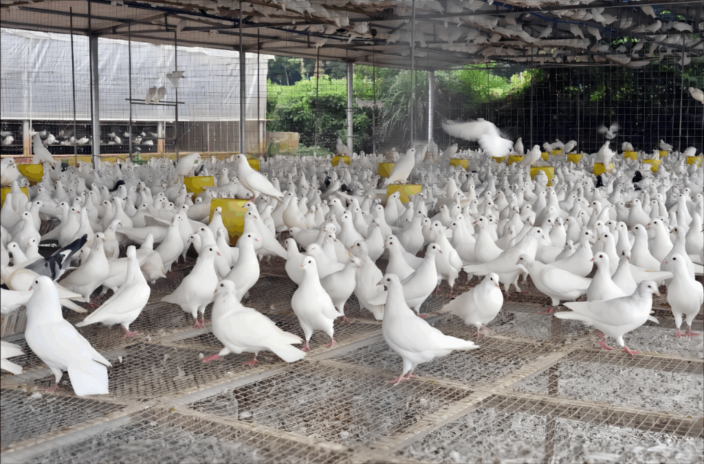 公司自2017年涉足肉鸽养殖领域以来,现已建成23栋现代化标准鸽舍,1栋后备种鸽飞棚,1栋育肥鸽舍以及1栋粪污处理厂房,同时配备了仓库、药房、种蛋孵化用房、员工宿舍和行政用房等完善的配套设施设备,总占地面积50亩。共养殖种鸽达7万对,年生产优质乳鸽200万只,是一个现代化的养殖基地。在2024年与三江镇江源村合作,利用闲置的江源小学校址投资建设了一座肉鸽加工厂。